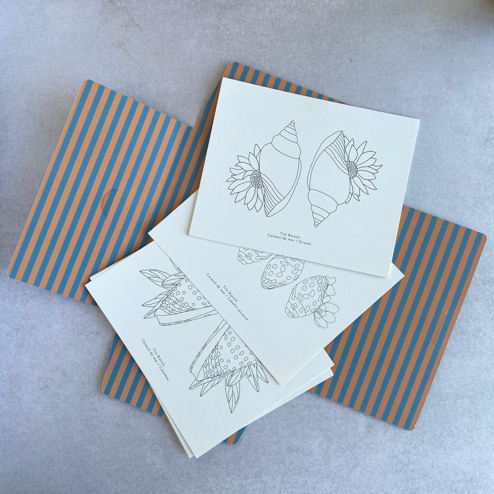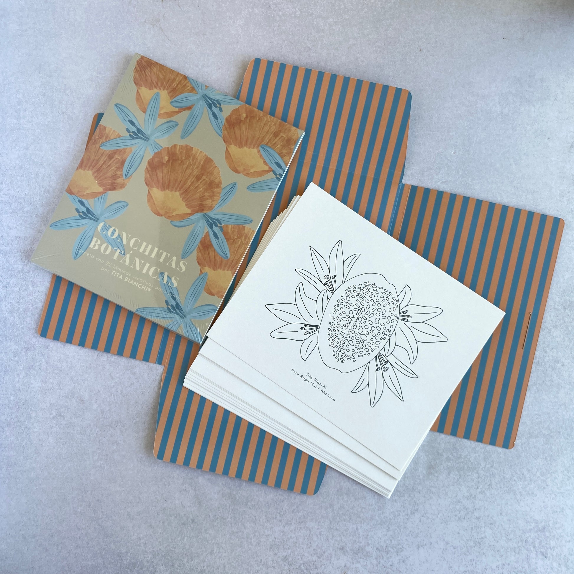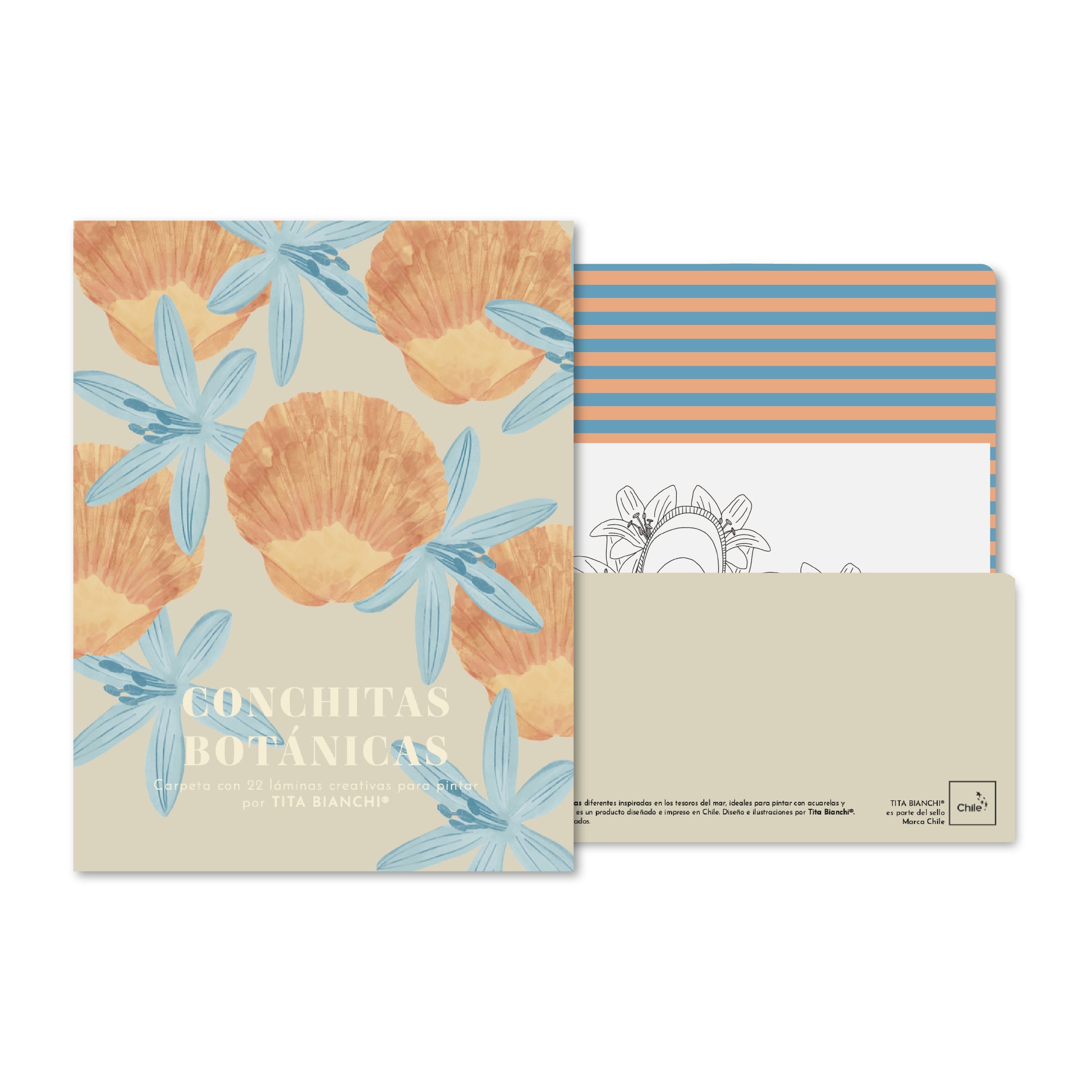Esta carpeta es un nuevo formato de los libros para pintar, son láminas sueltas con ilustraciones inspiradas en la naturaleza y las conchitas de la playa y las flores.