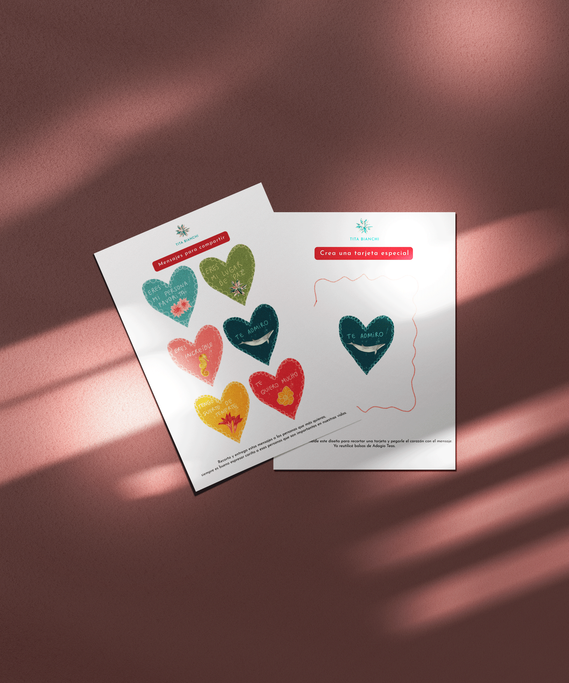 Incluye 2 hojas con el tutorial para realizarlas, en una encontrarás 6 corazones con mensajes y en otra el molde para hacer las tarjetas.